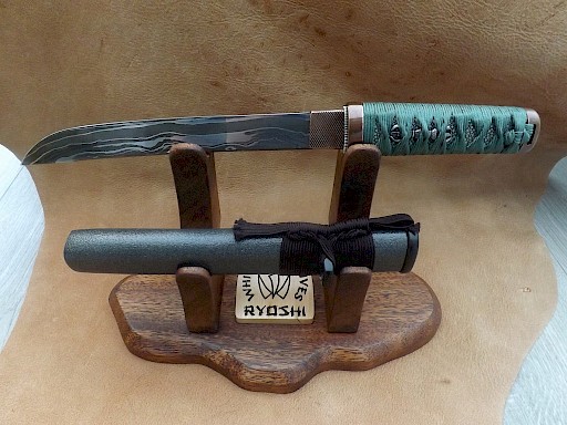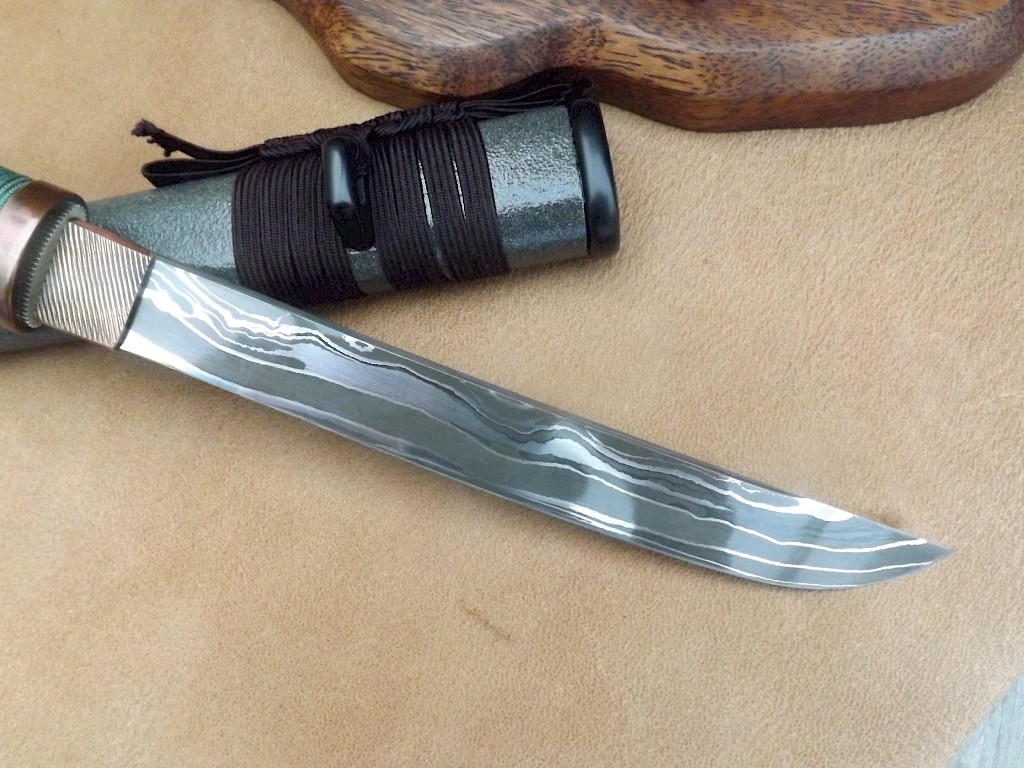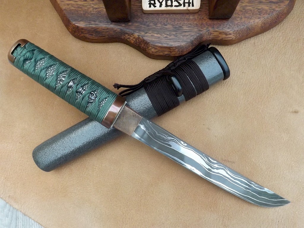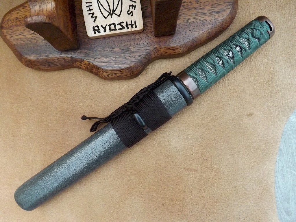 This Japanese style hybrid Tanto has a blade made from layered Shiro 2 Hitachi white paper steel. The blade has been acid etched which brings out its dark core and lighter outer layers. The blade length is around 192mm, blade thickness is 5mm on the spine and the overall length of the knife is 312mm. The handle is wrapped in Tetsu, greyish/green Japanese silk Ito which has then been reinforced with resin. The Ito lays over black Samigawa/ray… View More