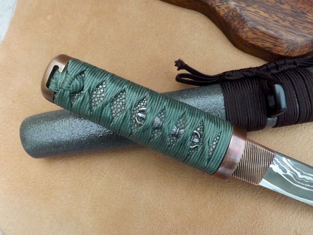 Asagiri is a traditional style tanto with a laminated blade made with an L-3, 52100 high carbon ball bearing steel core and laminated with cheeks made from L-3 and 1095 high carbon steel. It has a blade length of 210mm, a blade width of 25mm, the blade thickness is just over 4.5mm and the overall length of the tanto is 330mm. The copper habaki has a patterned surface which has been aged with liver of sulphur. The handle is of a traditional… View More